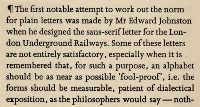 ![]() A roupagem que Gill usava, identificava-o como uma forte personalidade, um verdadeiro character britânico, da vertente excêntrica; também um autêntico free thinker. Sempre de chapéu e calçando botas, fazia assim «a necessária reverência aos pés e à cabeça». Alegava que tanto homens como mulheres deveriam usar cómodas togas romanas. As roupas que ele usava, tinham antes que mais a função de serem confortáveis e vistosas; sinais dos seus ideais, assim como uma maneira de se delimitar da uniforme, triste e cinzenta massa humana («dumb driven cattle») que era o que lhe parecia ser a maioria dos seus embrutecidos contemporâneos. Gill conseguiu subvencionar a maior parte da sua existência com a sua actividade tipográfica e publicista. Na sua ética profissional, as formas das letras deviam, antes que mais, proporcionar excelente legibilidade, a escrita devia de ser clara, livre de brincadeiras e ornamentos e devia de ser ornada com vistosas iniciais. Para Eric Gill era o difícil jogo entre o claro e o escuro e o contraste entre as linhas finas e grossas que davam a necessária tensão às contraformas, aos espaços brancos. Este e outros aspectos podem ser detectados em toda sua impressionante obra pluridisciplinar e na sua tipografia, que nos legou duas das mais exitosas letras do século XX. ![]() Eric Gill foi aluno, camarada e admirador do desenhador de letras Edward Johnston. Ambos, mestre e discípulo, dedicaram-se ao estudos de letras lapidares, ambos eram apreciadores convictos das letras renascentistas. Fontes de Eric Gill
