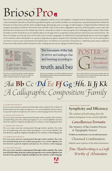 Na Brioso Pro, Bob Slimbach integrou toda a sua perícia e os aprofundados estudos da caligrafia humanista da Renascença italiana (ver exemplo em baixo). Deste esforço resultou uma fonte de nítida inspiração caligráfica. As itálicas (normais e Swash) estão admiravelmente integradas nesta extensa família, apta a satisfazer as exigências de qualquer profissional do desenho gráfico. Faz parte dos requintes da Brioso a escolha entre cinco desenhos, com pesos ópticos decrescentes: Caption, para legendagem; Regular, para texto corrido; Su.head, para subtítulos; o fino Display, para headlines.