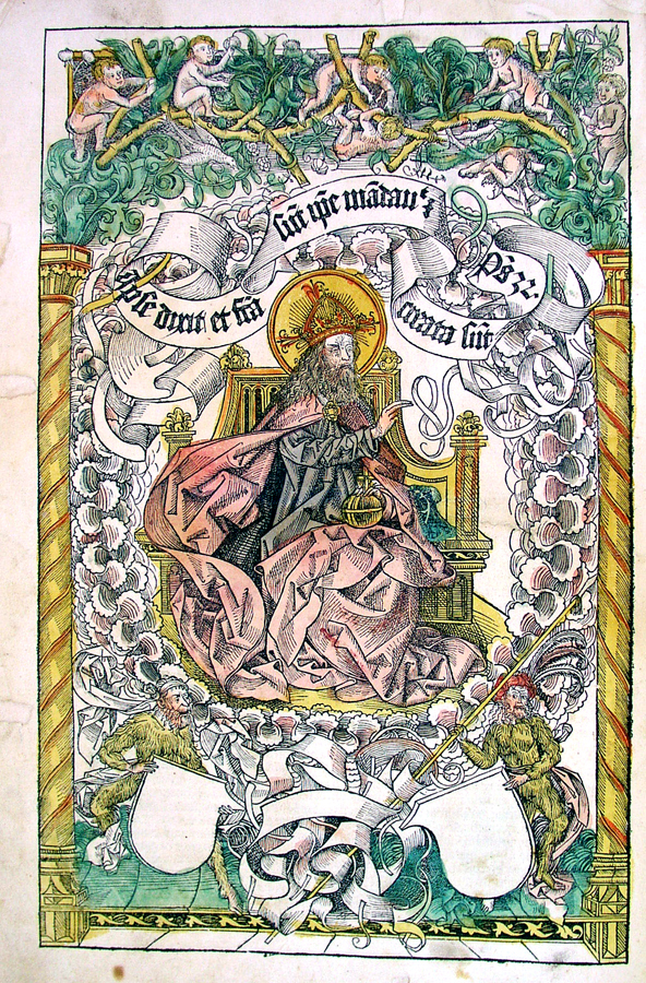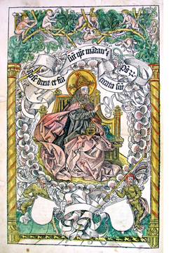 Crónica de NurembergAuge e esplendor do livro medievalIncunábulo publicado pela primeira vez em latim em 12 de junho de 1493, como edições em tradução em alemão a partir de 23 de Dezembro de 1493. A Crónica é uma história do mundo ilustrada, dividida em sete partes. O autor é Hartmann Schedel, e Georg Alt fez a tradução para o alemão. Albrecht Dürer era aprendiz durante a feitura das 1804 ilustrações em xilogravura.