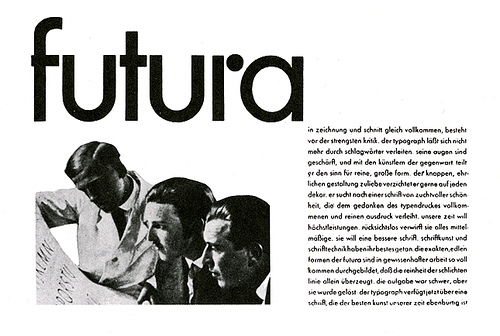 ![]() Entre as sem serifas mais notáveis da época entre a Primeira e a Segunda Guerra Mundial, está a fonte Futura. Desenhada entre 1924 e 1926 por Paul Renner, é uma letra bem representativa da clareza defendida nos manifestos da Bauhaus, com evidente construção geométrica. Sóbria, neutral, clara, elegante, bem equilibrada, legível (em corpos grandes, mas também em texto corrido, a Futura apresenta as características preferidas pelos designers vanguardistas dos anos 20 e 30. Parece construída com régua e compasso, e as versões preliminares têm óbvias afinidades com as experiências tipográficas do anos 20. Mas assim como a Gill Sans (a outra importante sem serifa da época) se inspirou directamente no tipo que Edward Johnston desenhara para os transportes urbanos londrinos, também a Futura foi derivada de letras já existentes, por exemplo da Kramer-Grotesk, uma sem serifa desenhada pelo arquitecto alemão Ferdinand Kramer para uso do município de Frankfurt am Main, em todas as suas publicações. Outra letra que terá servido de modelo e inspiração foi a Erbar Grotesk, desenhada por Jakob Erbar para a Fundição Ludwig & Mayer (a partir de 1922), da Mergenthaler Linotype e da Linotype Londres. Segundo os depoiamentos e as interpretações que não insinuam o plágio da Kramer ou da Erbar, a inspiração da Futura teria vindo das inscrições lapidares da Grécia clássica, que Renner analisou em pormenor. Os gregos usavam uma letra sem serifas de formas simples, e teria sido essa clareza estética que Renner captou.